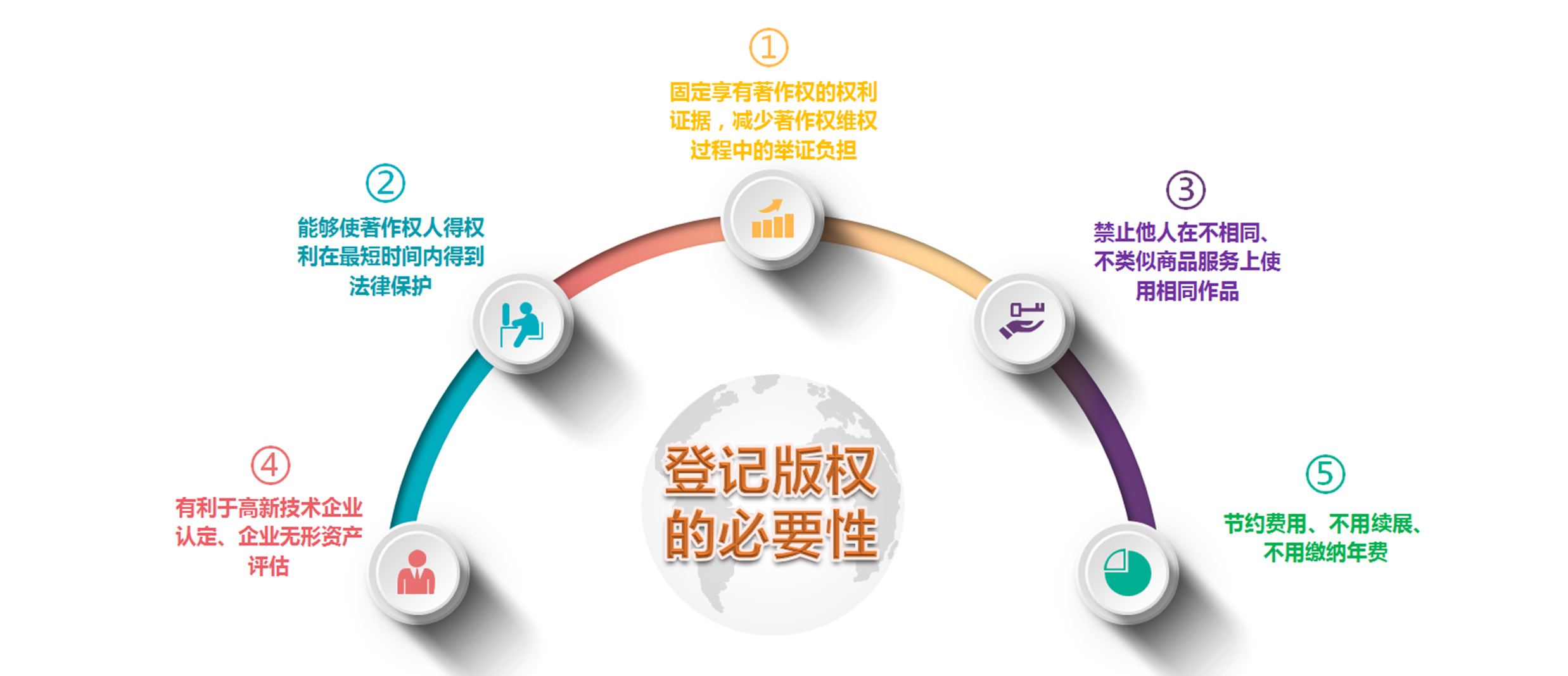 - 獨創性。版權登記的首要條件:作品必須為原創,即為作者獨立思考、構思而產生的作品,且無論作品的優劣,都可申請登記版權;